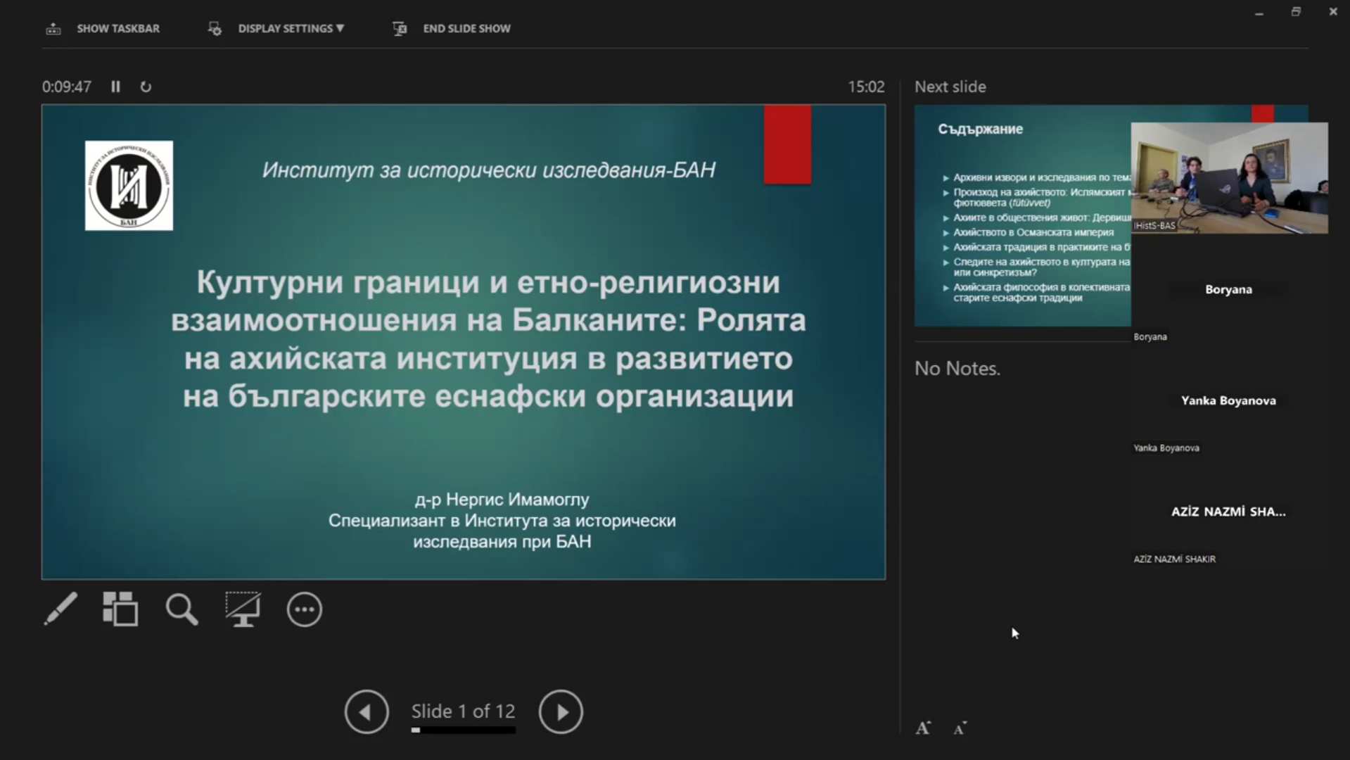 Публична лекция на проф. дин Иван Билярски – „Средновековното българско право“ (14.05.2024)October 12, 2025 Лекция на проф. д-р Илияна Марчева – „БАН и развитието на българистиката в историческа перспектива“October 12, 2025 Лекция на д-р Нергис Имамоглу – „Политиката на османизъм и идентичностни нагласи сред българите“October 12, 2025 Лекция на д-р Нергис Имамоглу – „Културни граници и етно-религиозни взаимоотношения на Балканите“October 12, 2025 Публична лекция на д-р Нергис Имамоглу – “Балканите през погледа на Другия” (30.01.2024)October 12, 2025 Лекция на д-р Симона Самуилова „Измеренията на американската публична дипломация в България…“October 12, 2025 Публична лекция на гл. ас. д-р Ивайло Найденов на тема „Изследванията на проф. Виржиния Паскалева, посветени на Средна Европа и българските търговци през XVIII–XIX в.“October 12, 2025
