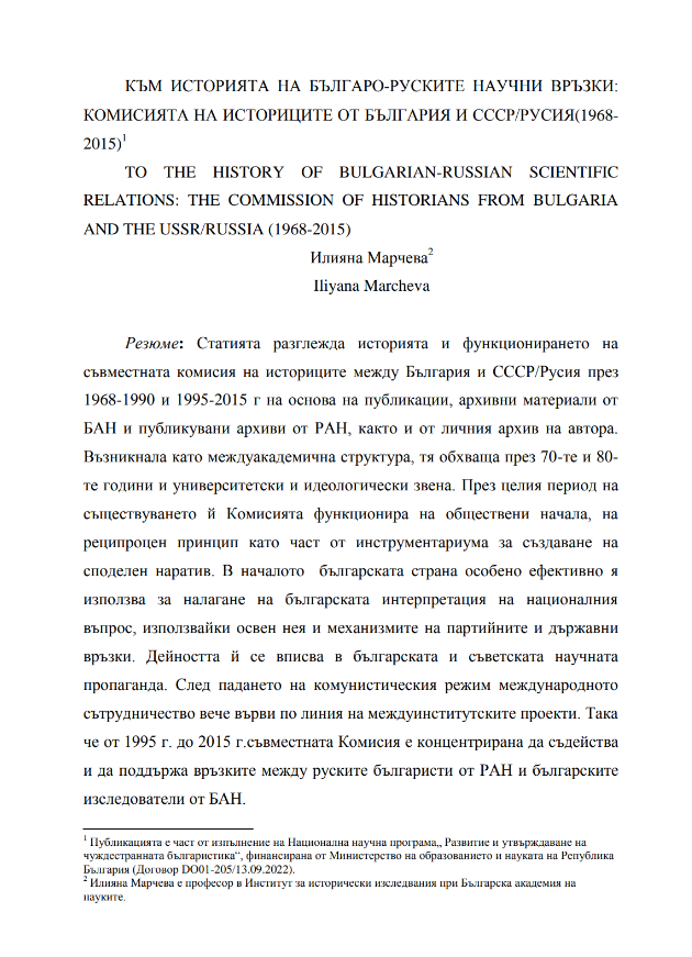 КЪМ ИСТОРИЯТА НА БЪЛГАРО-РУСКИТЕ НАУЧНИ ВРЪЗКИ: КОМИСИЯТА НА ИСТОРИЦИТЕ ОТ БЪЛГАРИЯ И СССР/РУСИЯ(1968- 2015)(Илияна Марчева)